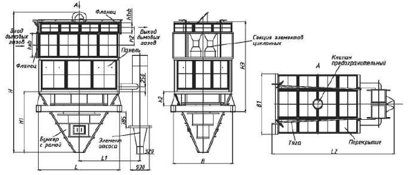 Батарейные циклоны БЦ-254-2-5x(3+2) — это ряд параллельно расположенных циклонных элементов в общем стальном корпусе с общим двухкамерным бункером. Количество циклонных элементов, расположенных в корпусе, определяется производительностью. Обычно это 20-56 элементов диаметром 254 мм. Каждый из них имеет две параллельно функционирующие секции с предохранительными клапанами, которые защищают устройство от повреждений на случай взрыва. Если нагрузка на циклон недостаточно высокая, при помощи шибера можно отключить одну из камер и циклон будет работать в половину своих возможностей.